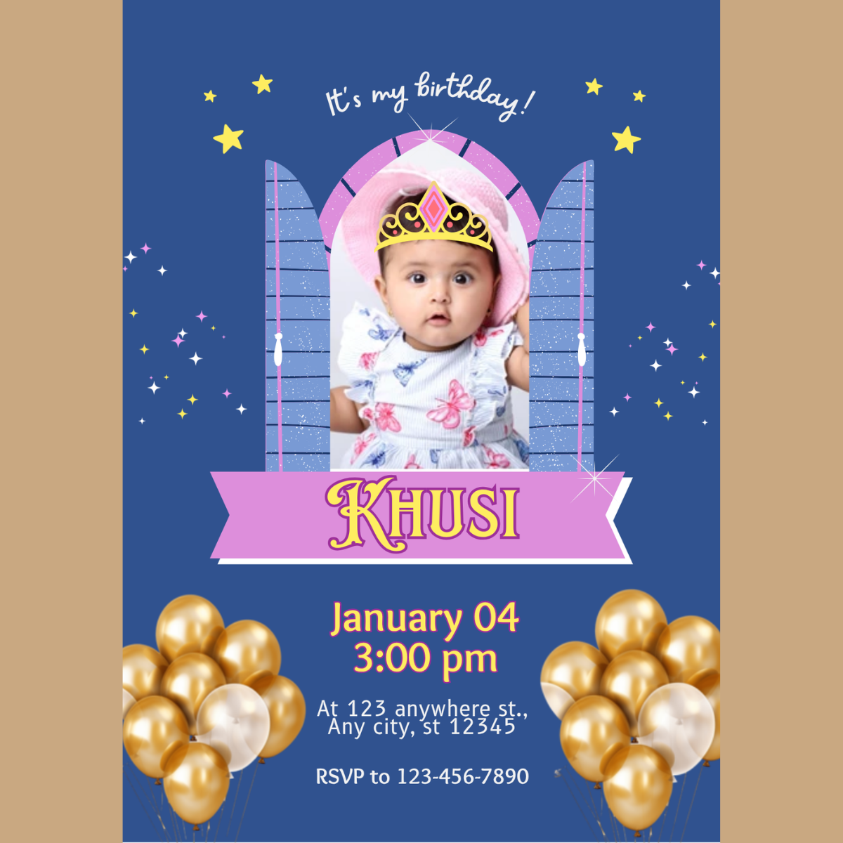 Make your baby’s first birthday truly special with this customizable invitation card. Bring your party vision to life with a template that’s joyful, elegant, and 100% yours!