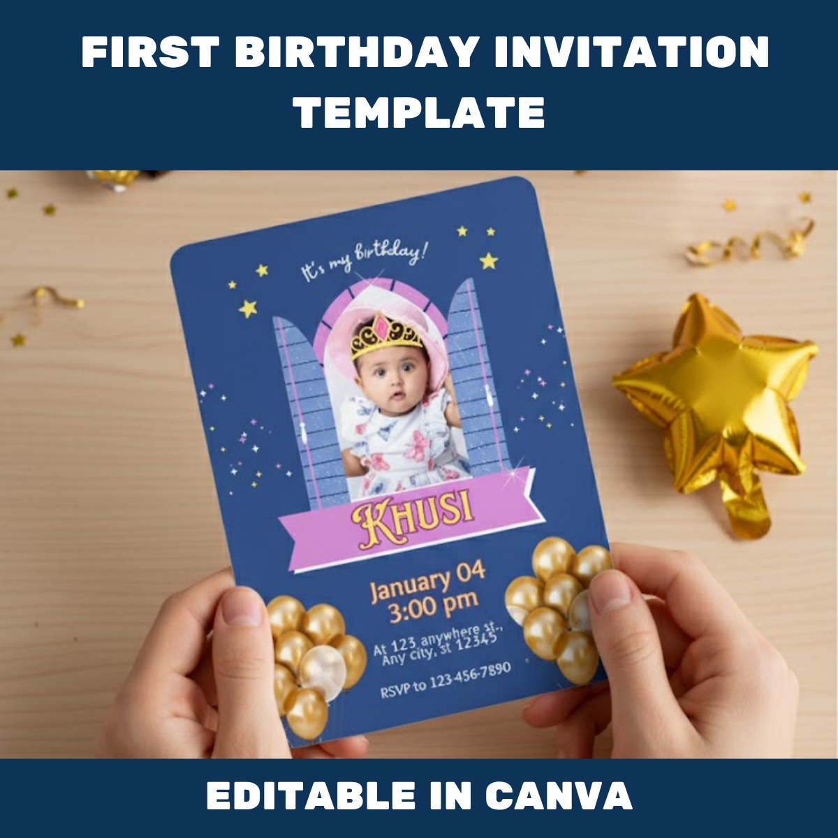 This 1st Birthday Party Invitation Card Template is fully customizable in Canva — no design experience needed! You can easily change colors, text, fonts, and even add your child’s photo. Within minutes, you’ll have a beautiful, ready-to-share invitation that perfectly matches your party theme.