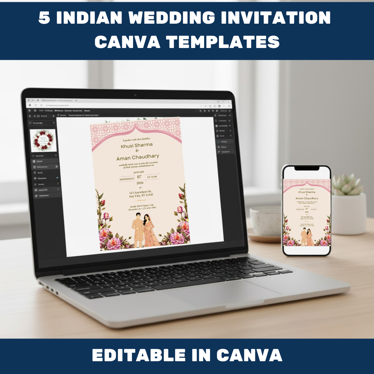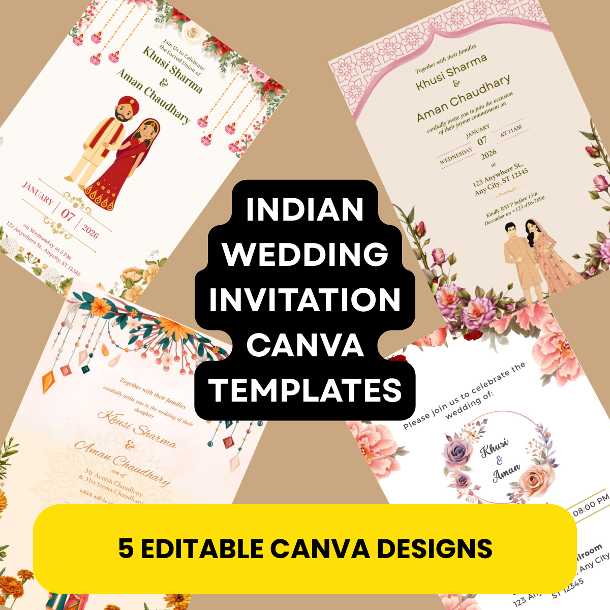 Celebrate your love and traditions with our Indian Wedding Invitation Canva Templates – a premium collection of 5 beautifully designed invitation cards that perfectly blend traditional Indian aesthetics with modern minimalist design. Whether you’re planning a royal wedding, a vibrant mehndi ceremony, or an elegant reception, these templates will help you create the perfect digital or printed wedding invitation in minutes.
