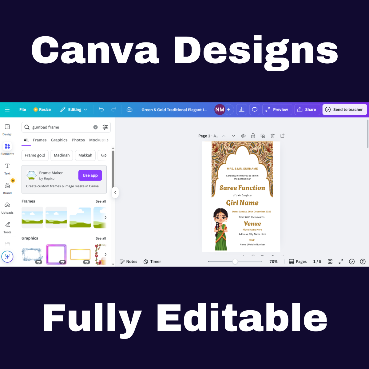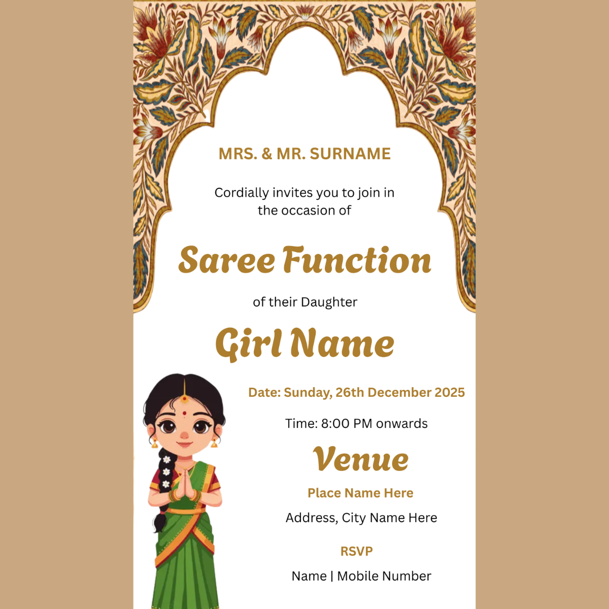 This Half Saree Function Invitation Card is made using Canva, making it beginner-friendly. You can edit text, change names, update function details, and adjust fonts without any hassle.