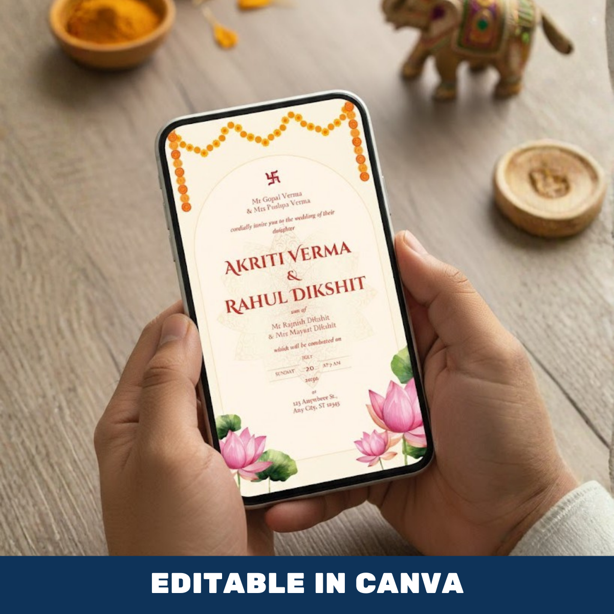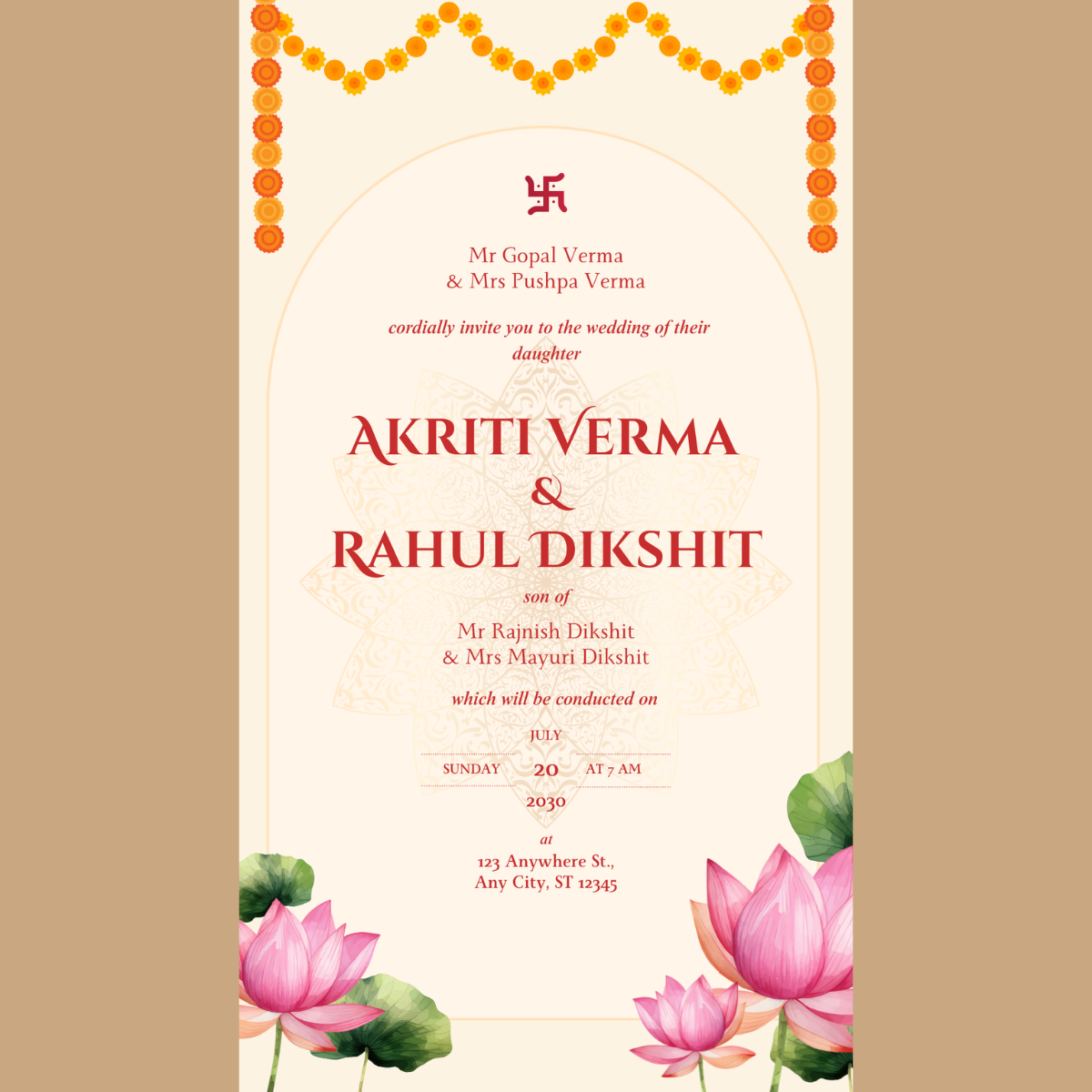 Designed with elegance and cultural sensitivity, this invitation template brings together traditional Indian elements with a modern, clean layout. Every detail is thoughtfully placed, so your wedding announcement feels respectful, graceful, and memorable.