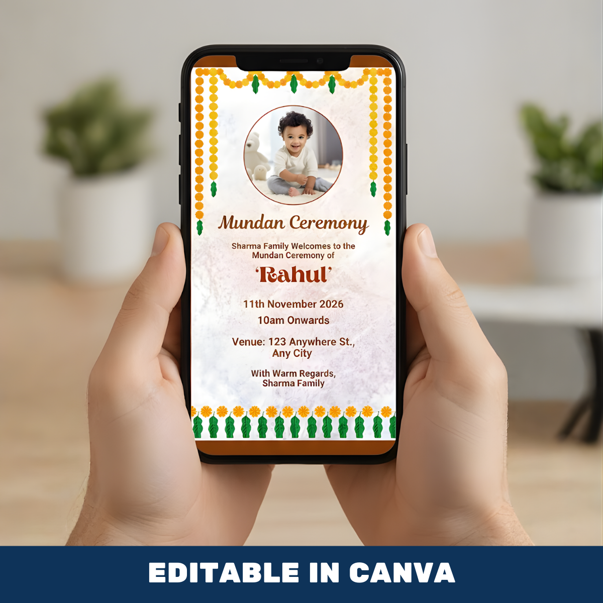 The template is ideal for WhatsApp sharing, printing, or posting online. Whether you’re hosting the Mundan at home, temple, or a small event hall, the card fits every setting. And since it’s Canva-based, the entire editing process feels smooth even for beginners.