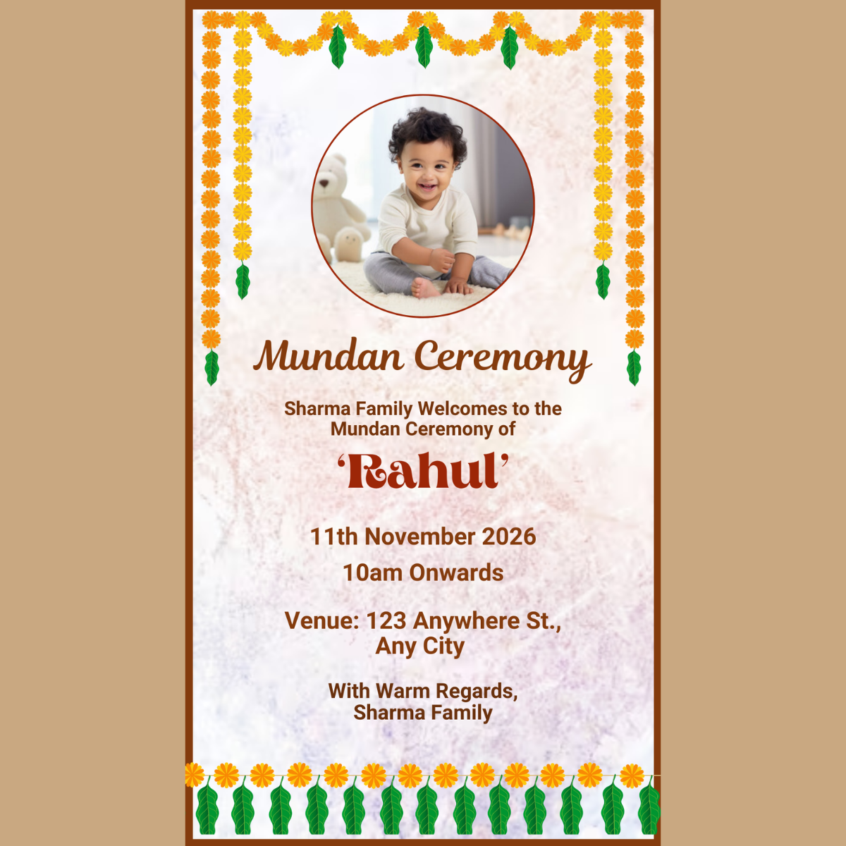 The design carries a soft traditional touch—something that feels warm and Indian, yet still modern enough for today’s digital invites. Perfect for parents who want a sweet and respectful invitation without spending hours creating it.